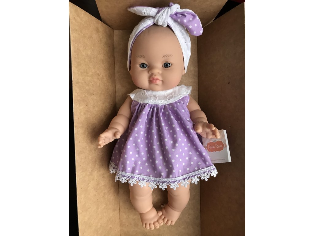 Elisa je krásne modrooké bábätko vo fialových šatách s bielymi bodkami. Šaty sú zdobené bielym životikom . Dolný okraj šiat zakočuje kvetinková lemovka. Z rovnakého materiálu je aj čelenka na hlavičke.