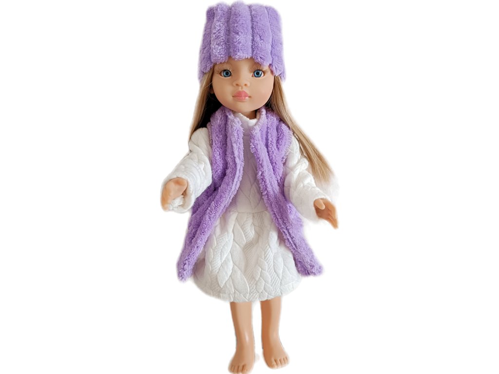 Bábika Julka má 32 cm, modré očká a dlhé svetlé vlásky. Oblečené má biele pletené šaty s točivou sukňou, fialovú vestičku kožušinovú a na hlave má fialovú kožušinkovú čiapku.