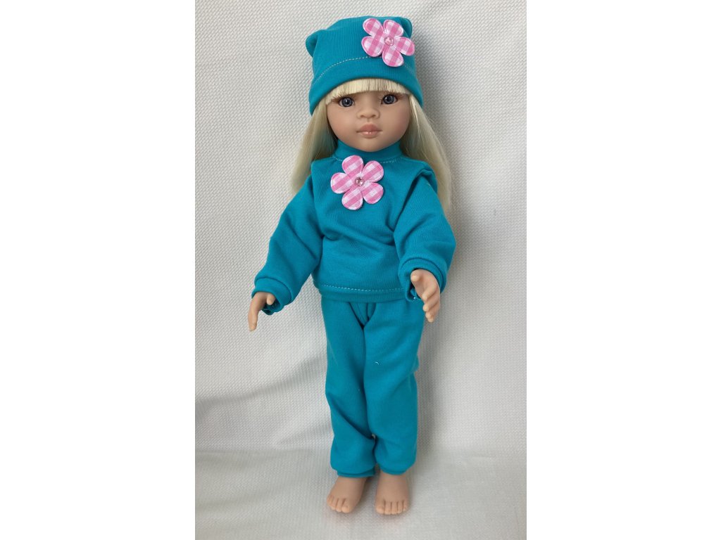 Bábika je oblečená v bavlnenej teplákovej súprave s čiapkou. Tepláky sú v páse na gumu a dolný okraj je spevnený lemom. Vrchný diel má dlhý rukáv, zakončený lemom. Na zadnom diely je suchý zips na ľahké obliekanie. Predný diel zdobí malá kvetinka. Bavlnená čiapka je dozdobená tiež malou kvetinkou. Bábika má 32 cm, má dlhé vlasy vhodné na česanie. Balená je v sáčku firmy Paola Reina