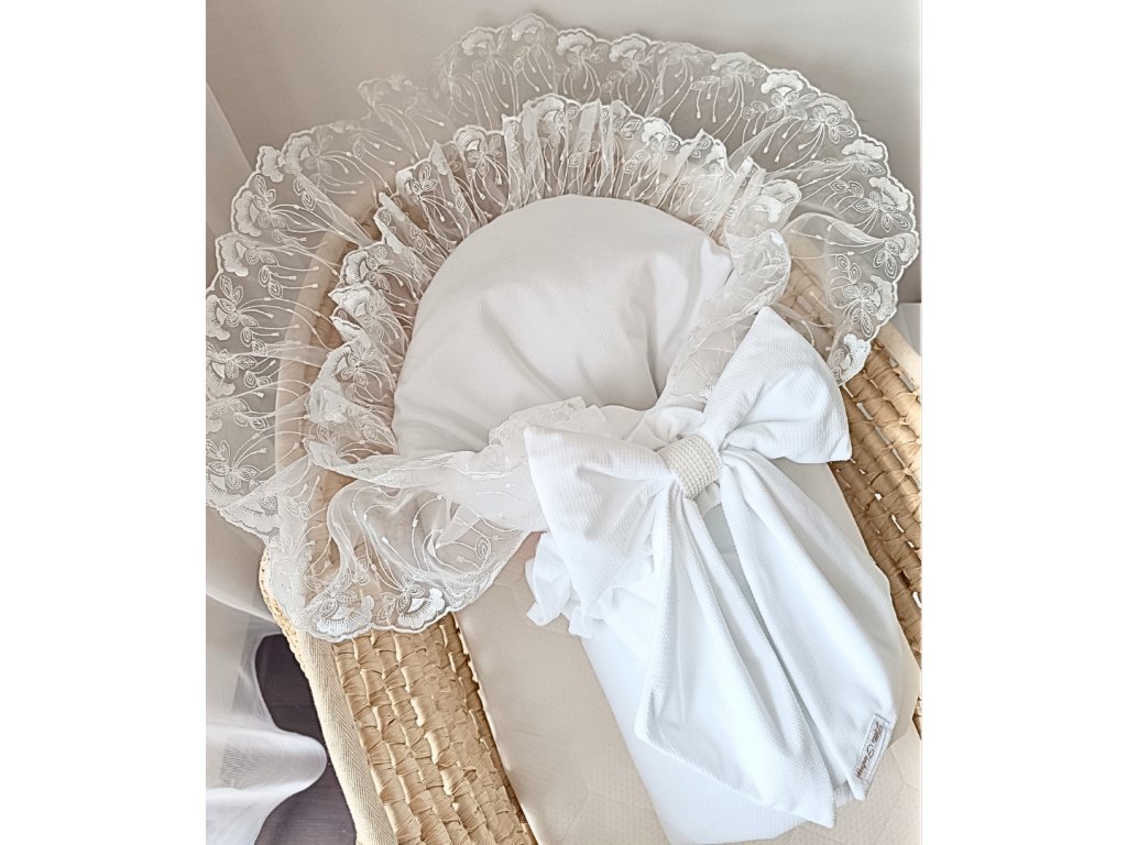Biela krstová zavinovačka s vyšívanou čipkou a veľkou mašľou s guličkami Little Fantasy