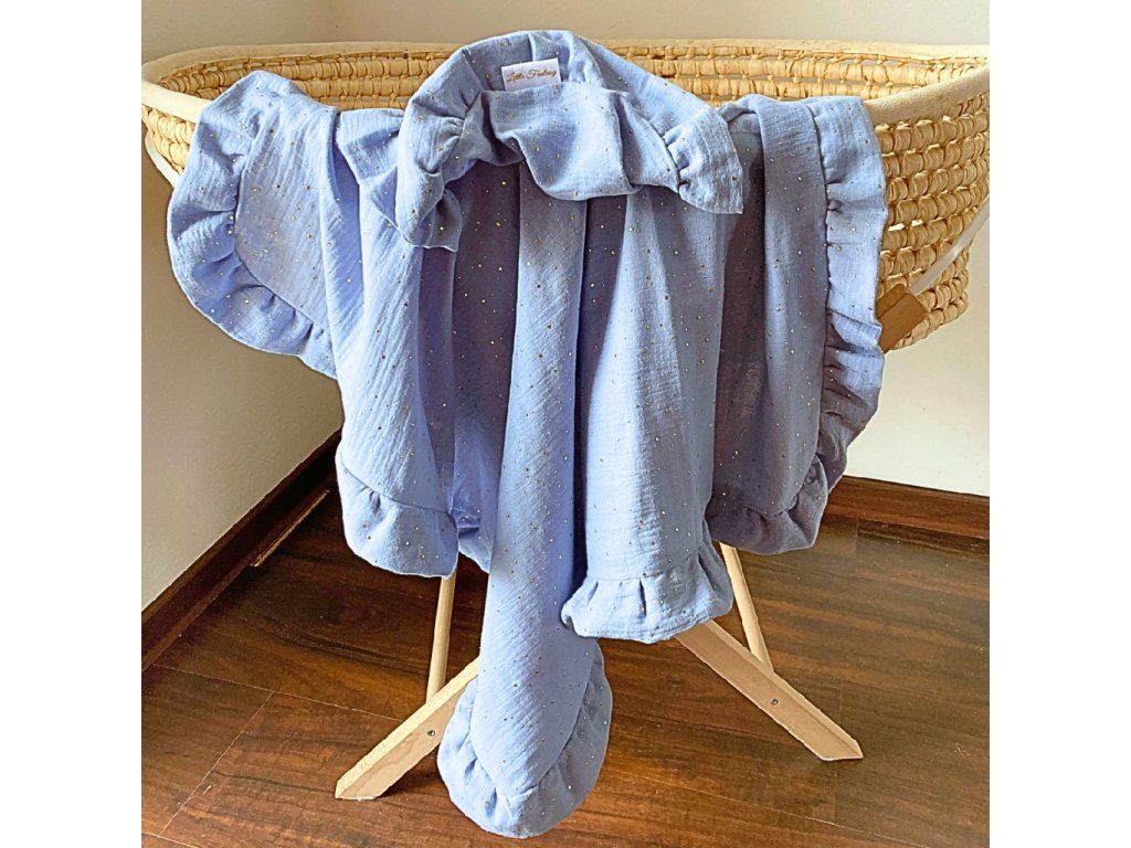Nevyhnutnosťou vo výbavičke pre bábätko je detská deka. Detská deka modrej farby so zlatými guličkami je vyrobená z mušelínu a ozdobená ručne riaseným volánom.