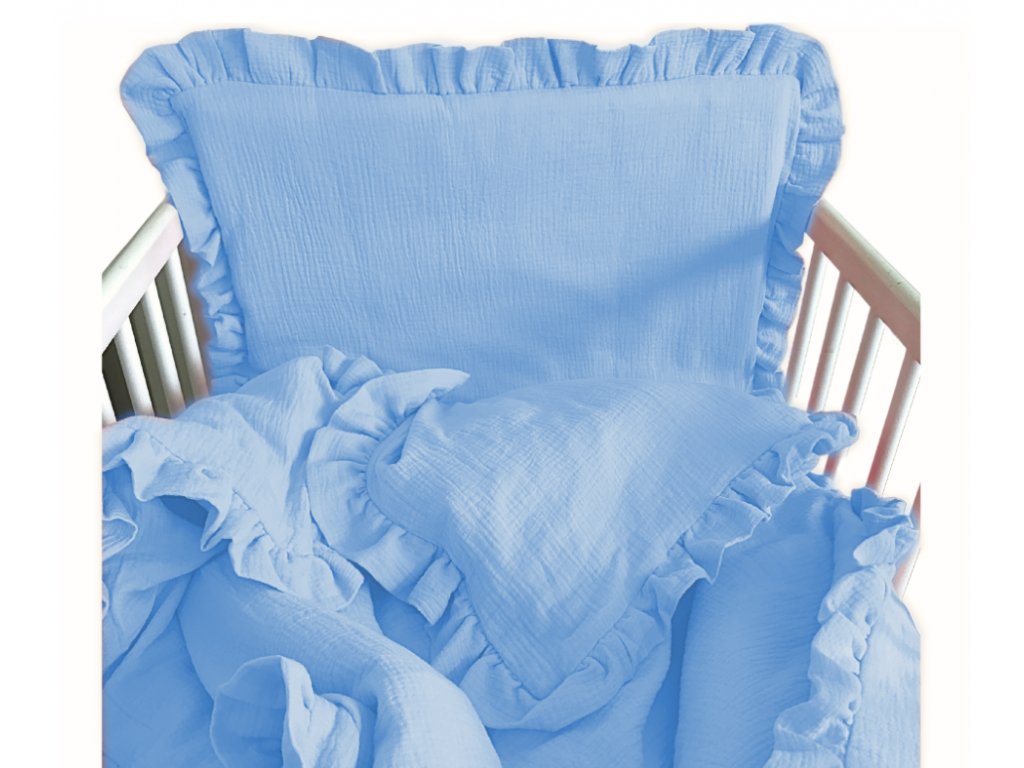 Set paplónik a vankúš s volánom z mušelínu je štýlovým a nadčasovým doplnkom do detskej postieľky.