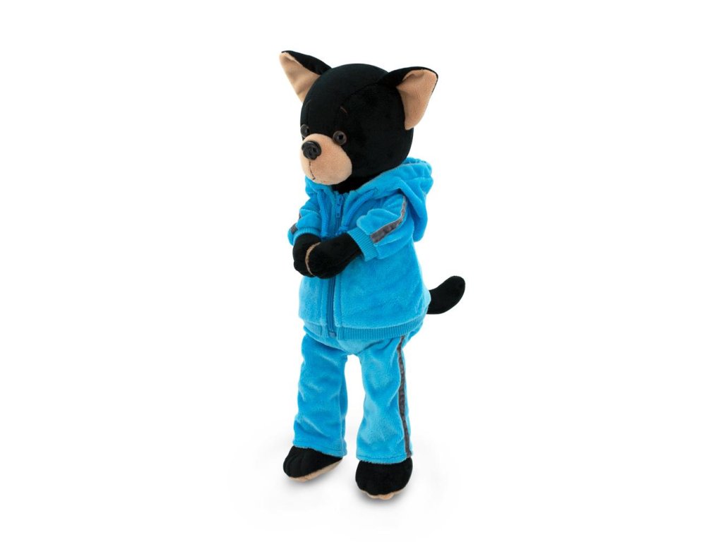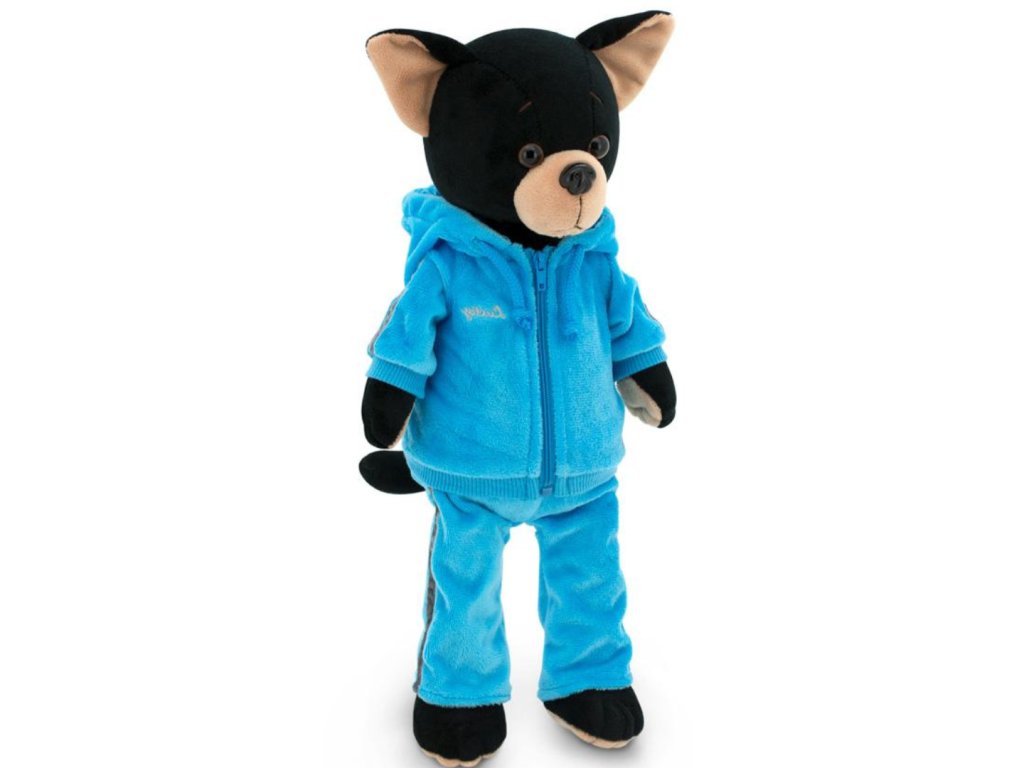 Hnedá čivava Buzz v modrom športovom oblečení má výšku 38 cm a balený je v modrej darčekovej krabici, kde je karton na vylúpnutie, z ktorého si deti vytvoria vešiak na šaty so 4 ramienkami.