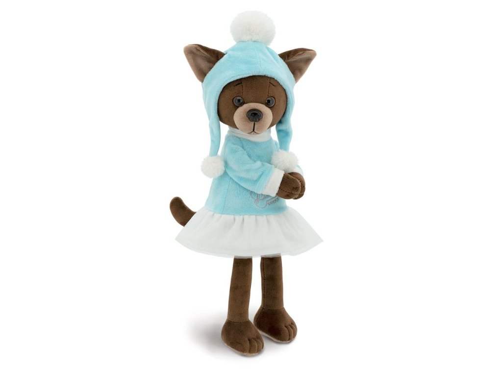 Hnedá čivava Kiki v modrom oblečení je pripravená na zimu. Na hlave má modrú čiapku s bielym brmbolcom a oblečené má modré šaty s dlým rukávom a bielou nariasenou sukňou.
