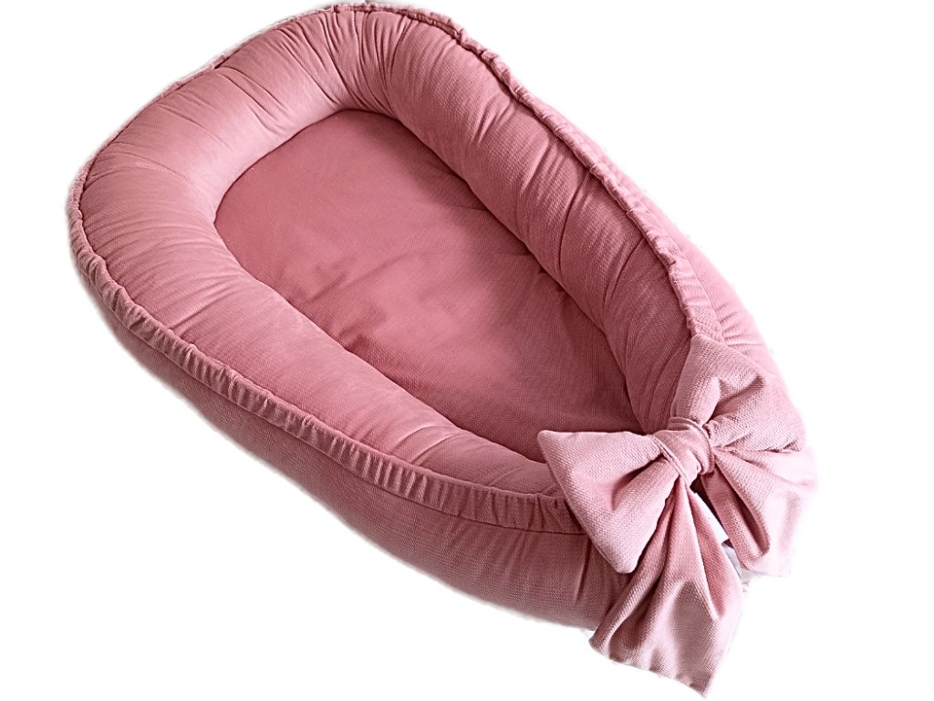 Hniezdo pre bábätko v púdrovej farbe s veľkou mašľou je ideálnym doplnkom pre novorodencov, ktorý zabezpečuje pohodlie a bezpečie počas spánku aj odpočinku