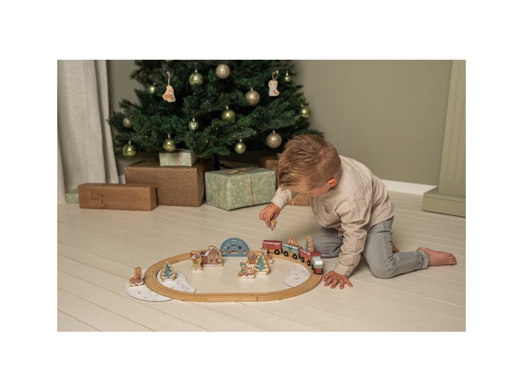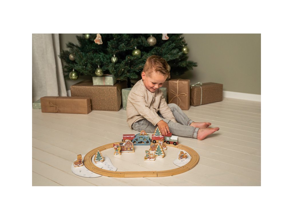 Sada obsahuje 10 dielov koľají, mašinku s tromi vagónmi a 10 ďalších doplnkov s motívmi zasneženej zimnej krajiny a Vianoc. Domček, postavičky, zvieratká aj stromy sú obojstranne potlačené. Zvieratká majú veľkosť vhodnú na naloženie do vagónov, aby mohli vyraziť na výlet vlakom.