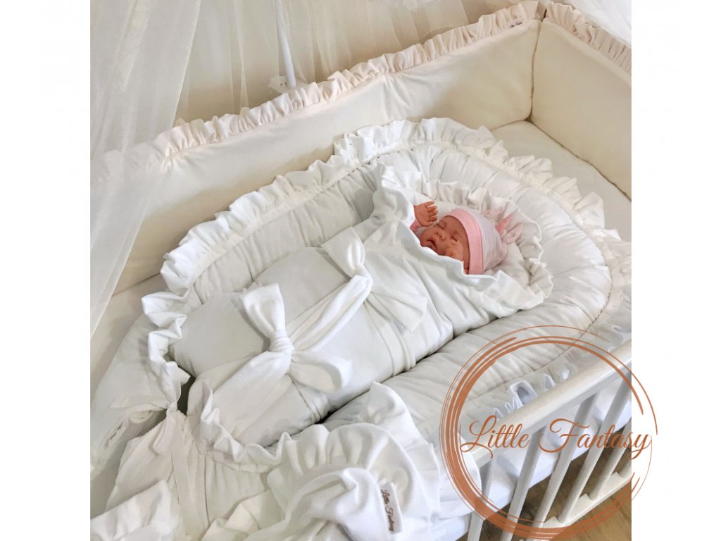 Upevnenie k postieľke za pomocou stúh. Mantinel do postieľky má ručne riasený volán.