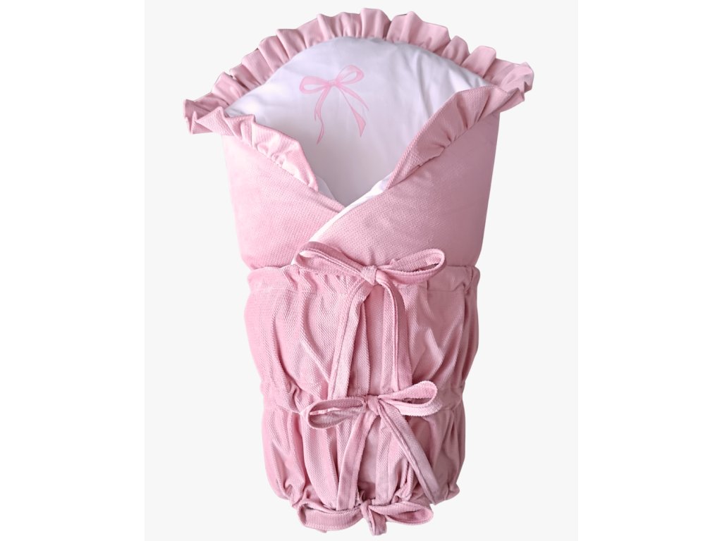 Táto páperová zavinovačka v ružovo-bielej kombinácii spája jemnú eleganciu s maximálnym pohodlím pre bábätko. Vrchná obliečka je ušitá z bavlnenej látky so vzorom ružových mašličiek, doplnená o ručné riasený volán po celom obvode, ktorý jej dodáva romantický vzhľad.