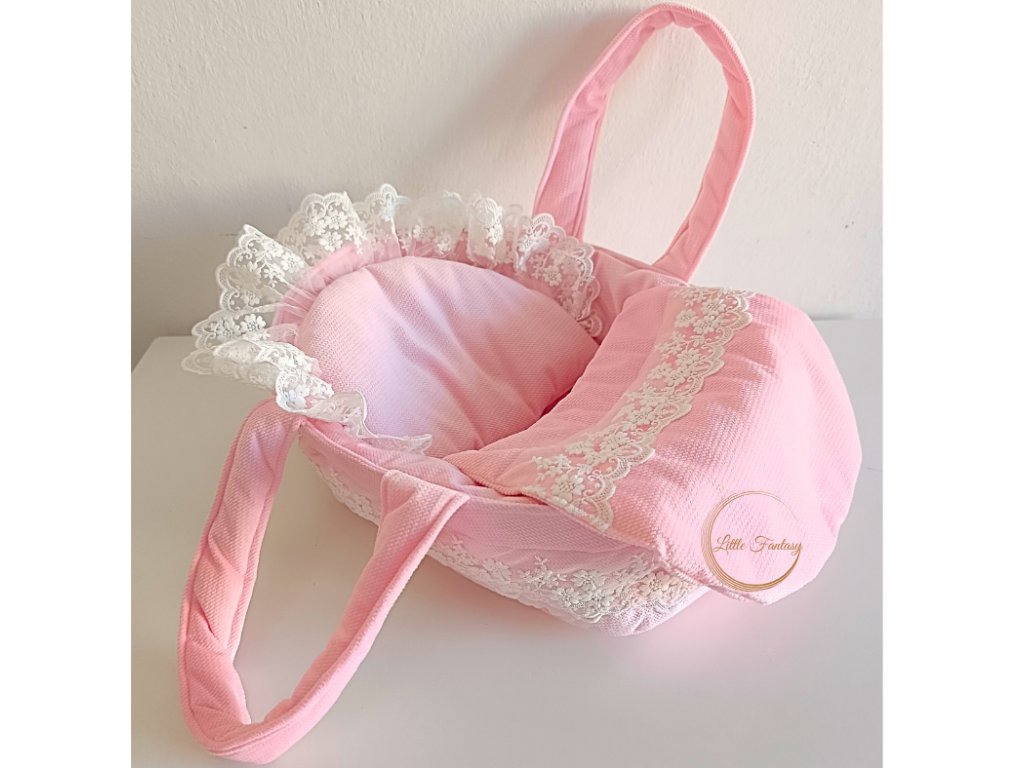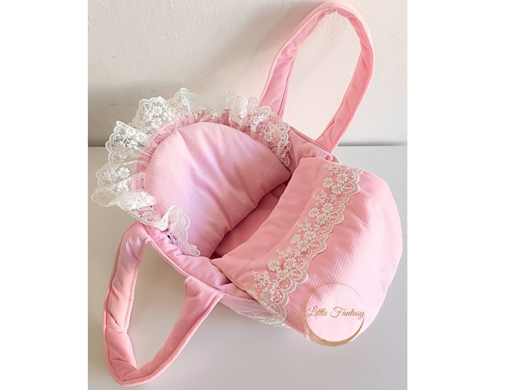 Táto nádherná ružová látková postieľka je ideálna pre malé maminky bábik. Vyrobená z mäkkej a príjemnej látky- velvet, doplnená o dve praktické ušká na jednoduché prenášanie. Po obvode je biela kvetinková čipka.