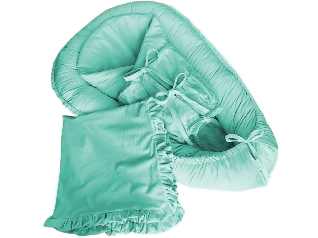 Výbavička pre bábätko set sa skladá z hniezda pre bábätko, zavinovačky a deky na prikrytie s volánmi.