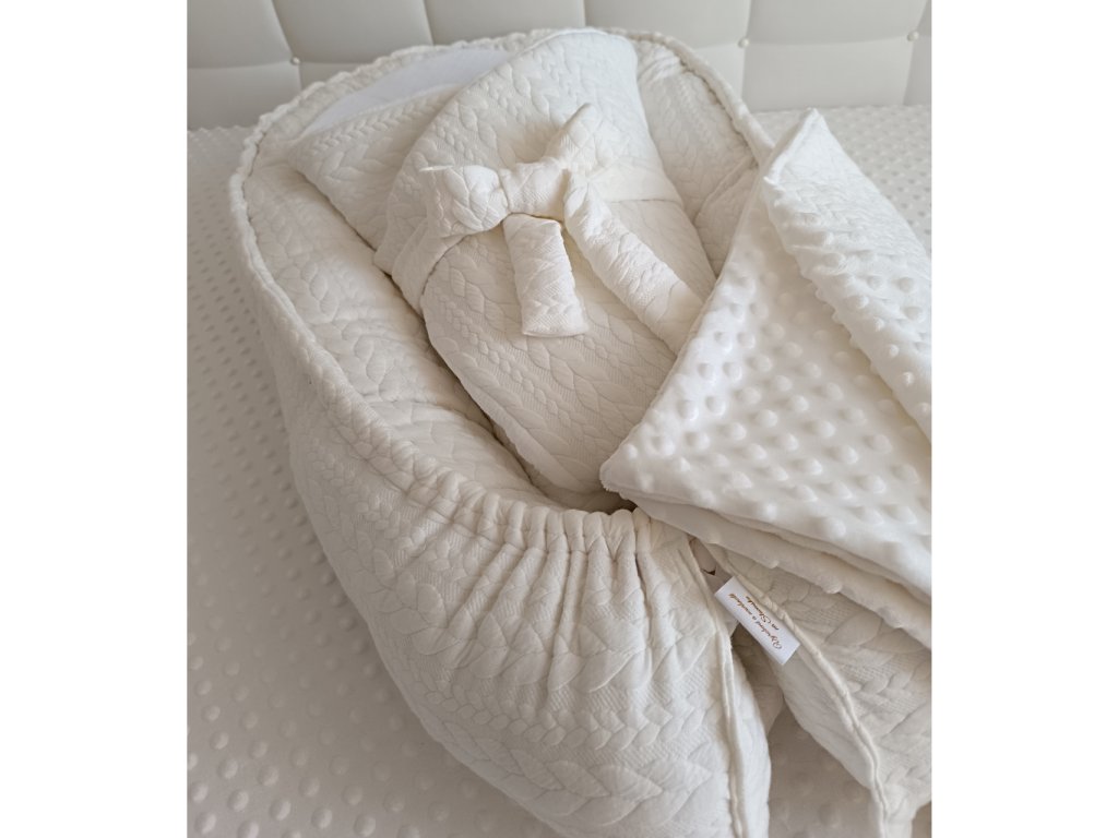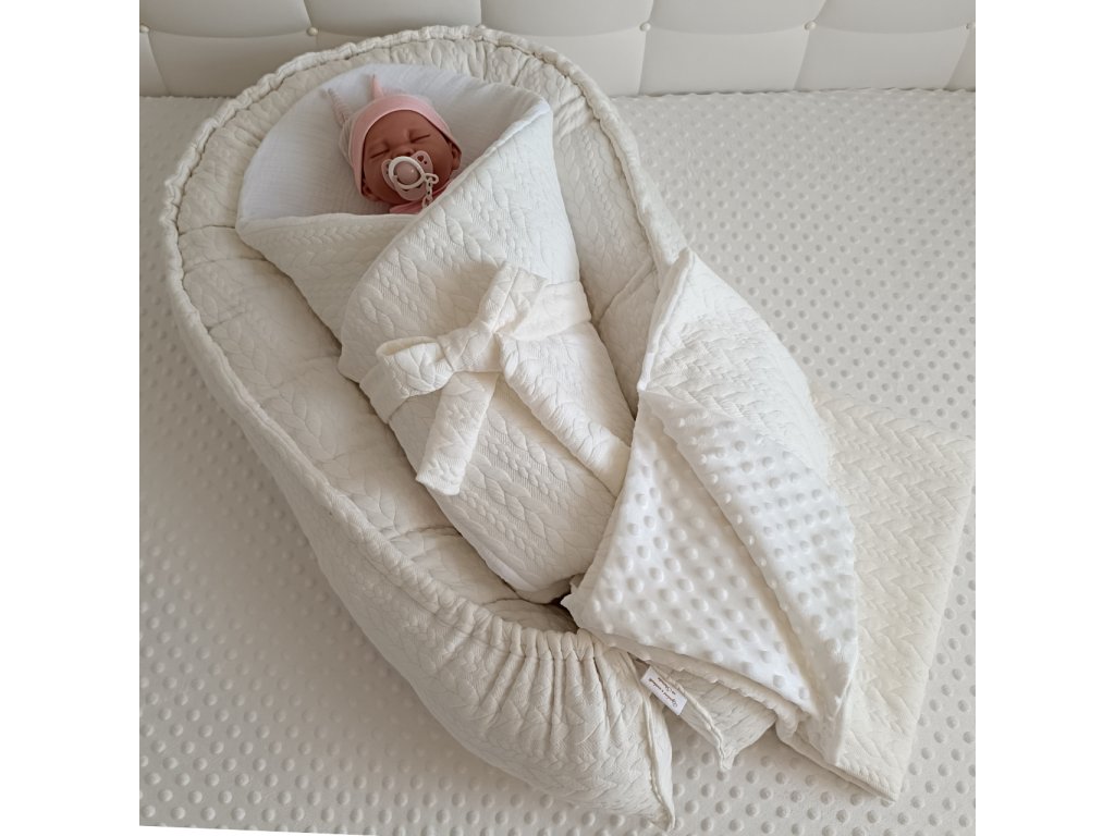 Kompletná výbavička pre bábätko 3 v 1 zahŕňa mäkké hniezdo, štýlovú zavinovačku s mašľou a jemnú detskú deku. Ideálna kombinácia pre prvé dni, spánok aj odpočinok vášho dieťatka.