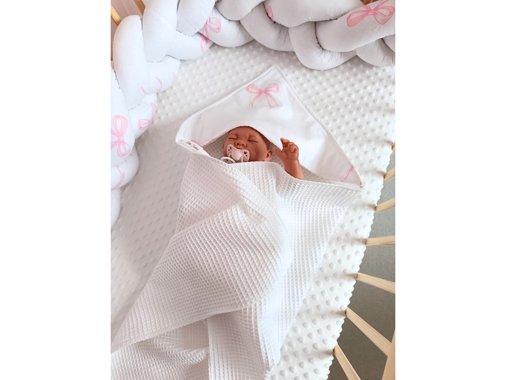 Dizajnovú osušku z wafflovej bavlny s mašličkami, ktorá rýchlo schne a je šetrná k pokožke bábätka,