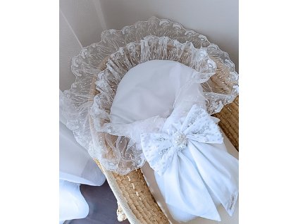 Zavinovačky na krst sú v decentných farbách skombinované s honosnou čipkou a mašľou na viazanie.