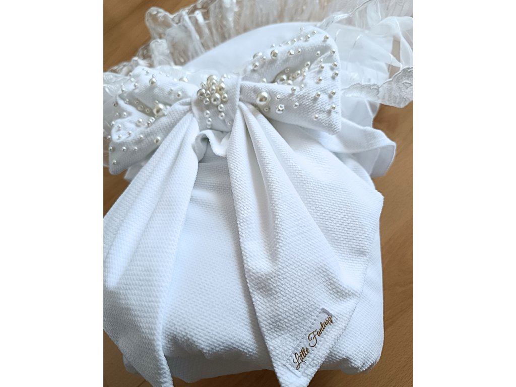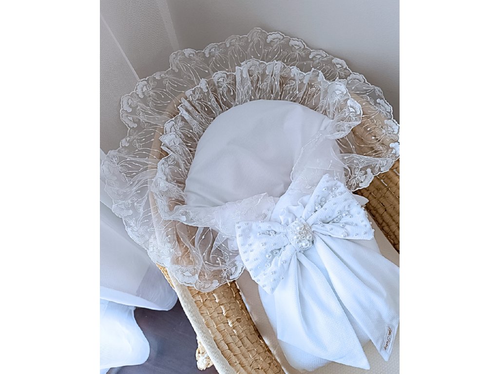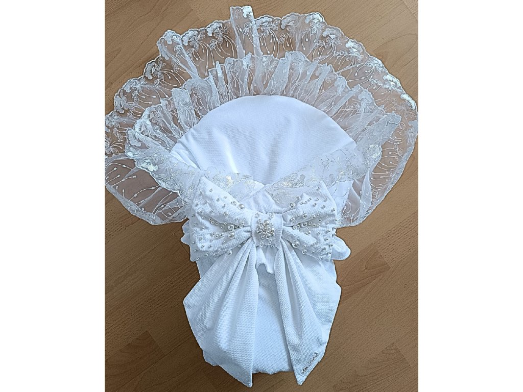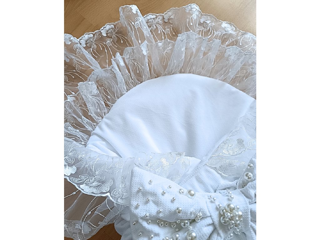 Zavinovačka na krst Little Fantasy biela s vyšívanou čipkou a mašľou s perličkami
