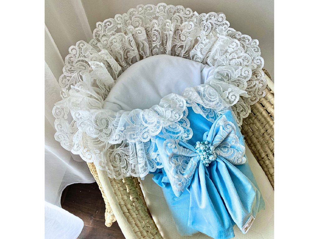 Zavinovačka je vyrobená z certifikovaného materiálu velvet v nezábudkovej farbe, má veľkú mašľu ozdobenú bielou čipkou a po obvode 2 rady vyšívanej bielej čipky.